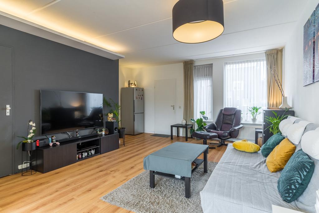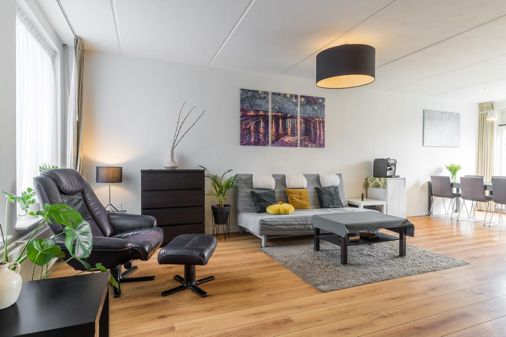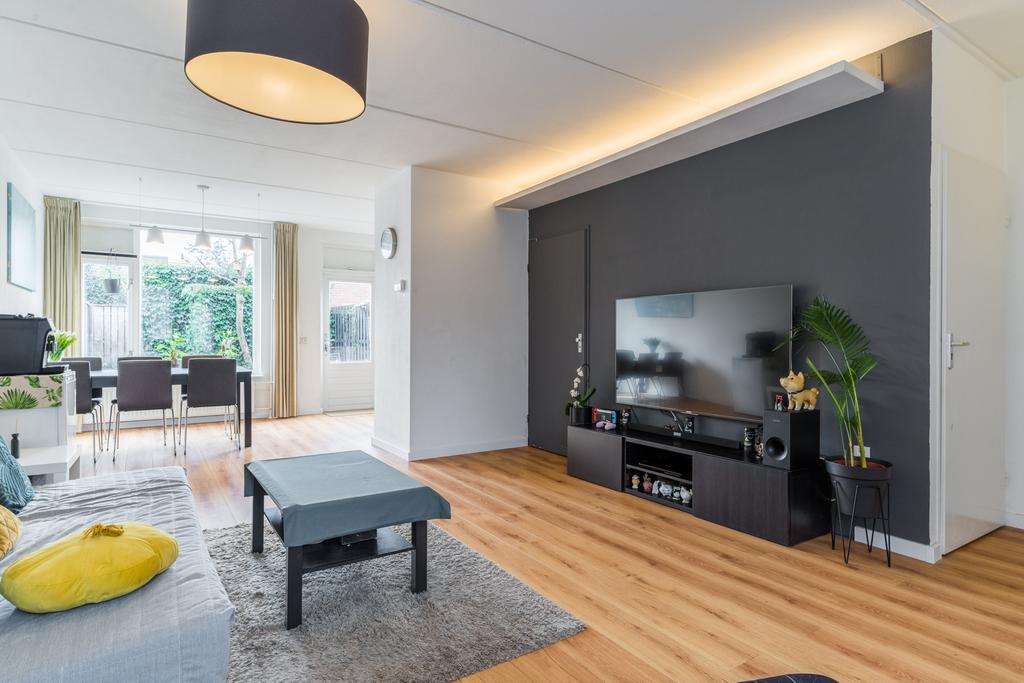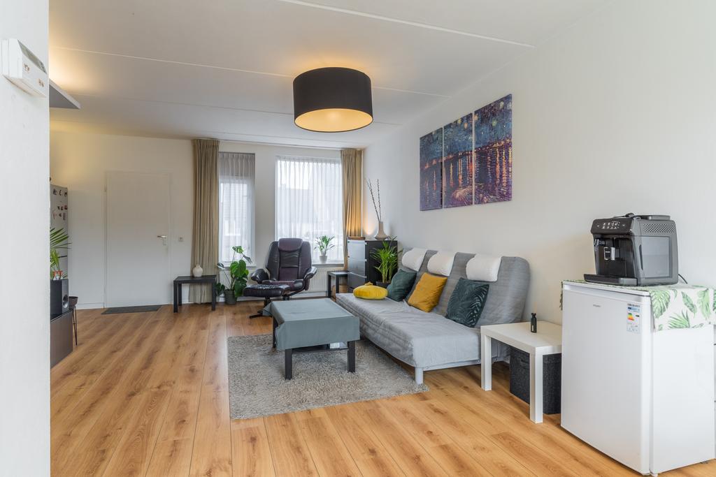 Sfeervolle living afgewerkt met een laminaatvloer, structuur wanden en een spuitwerk plafond.