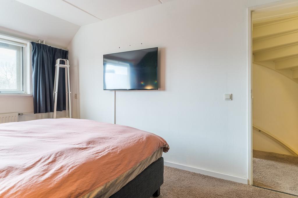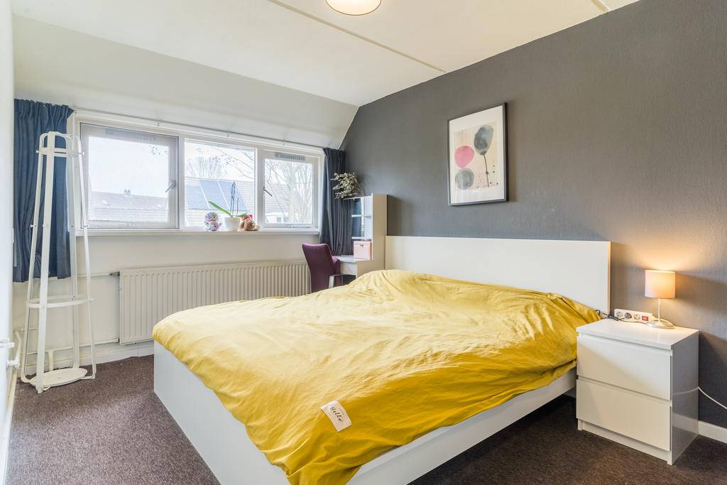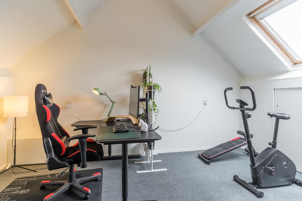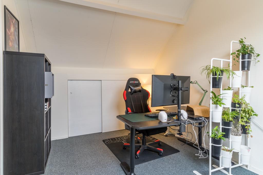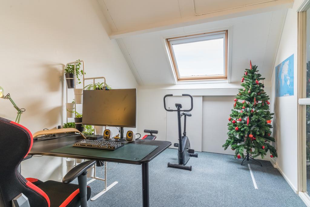 Slaapkamer 4 (zolderslaapkamer) met een Velux dakvenster, bergkasten onder de schuinte van de kap en afgewerkt met vloerbedekking en pleisterwerk wanden.