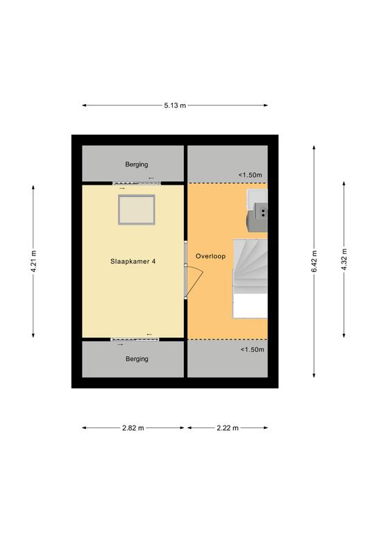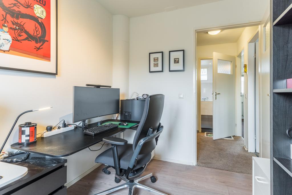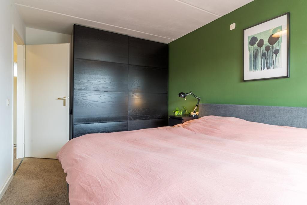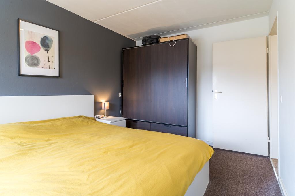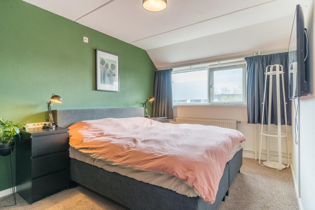Slaapkamer 4 (zolderslaapkamer) met een Velux dakvenster, bergkasten onder de schuinte van de kap en afgewerkt met vloerbedekking en pleisterwerk wanden.