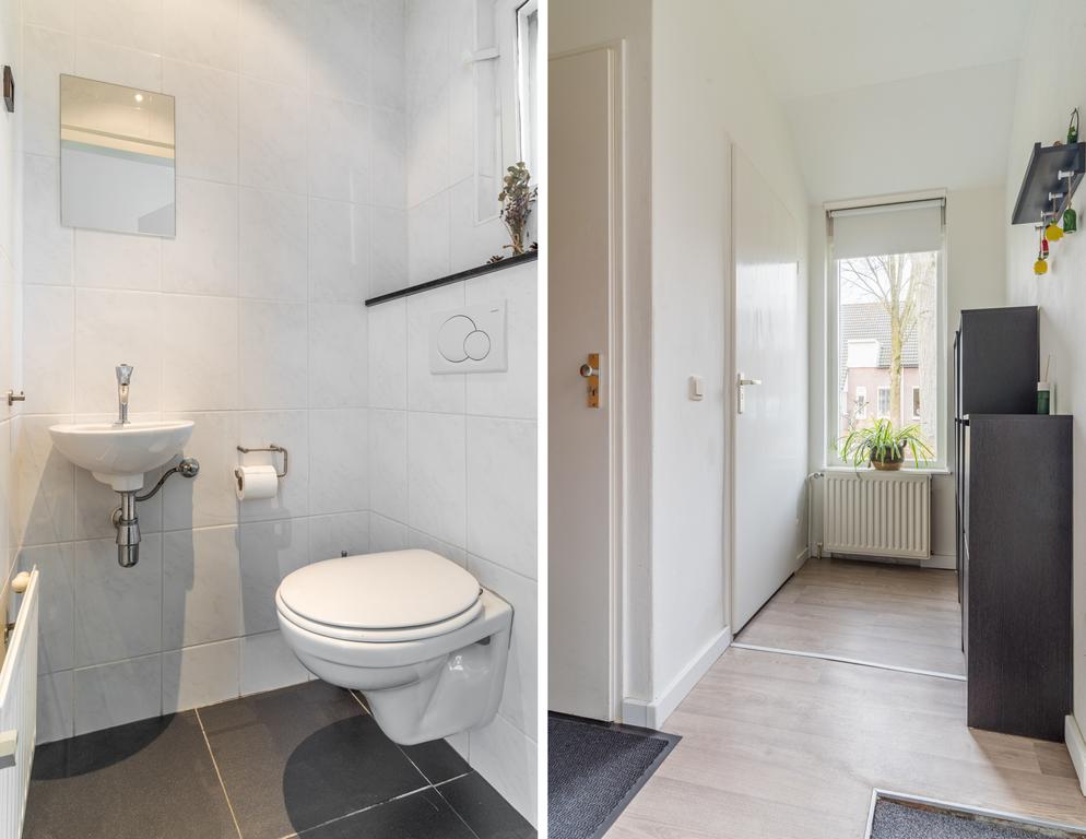 Betegelde toiletruimte met een zwevend closet en fonteintje.
