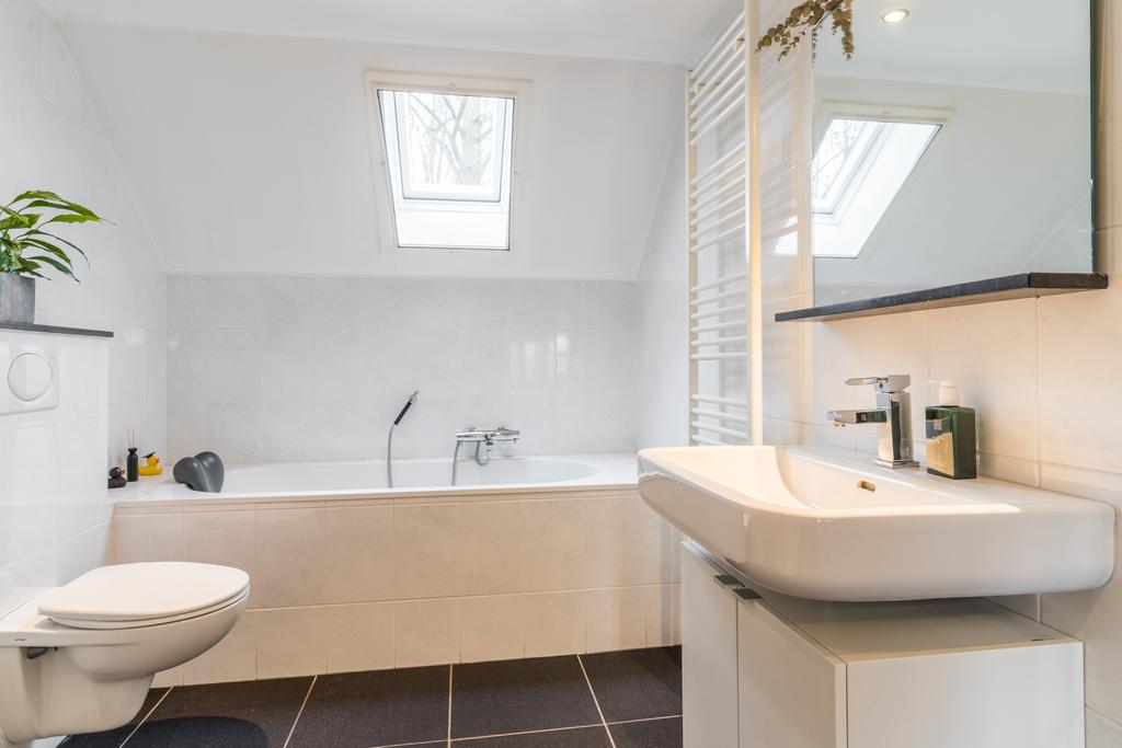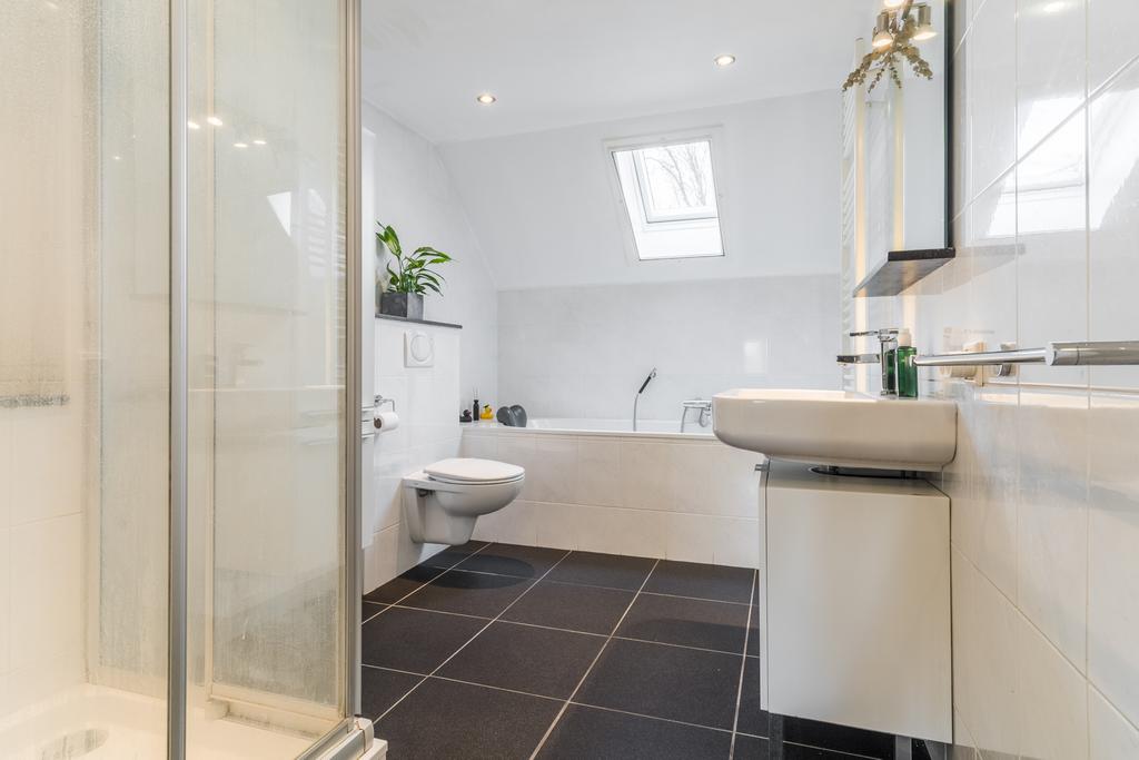 Ruime betegelde badkamer voorzien van een ligbad, separate douche cabine, wastafel, zwevend closet en thermostaatkranen bij zowel het ligbad als douche.