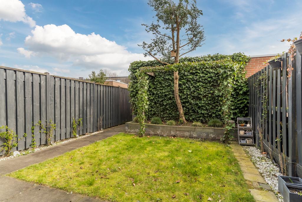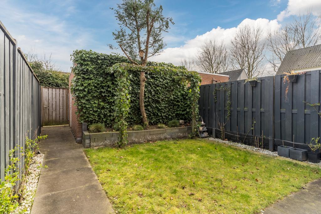 De verzorgde achtertuin met een afsluitbare achterom en een houten delen erfafscheiding is gelegen op zonzijde en aangelegd met siertegels, terras, gazon en beplanting.