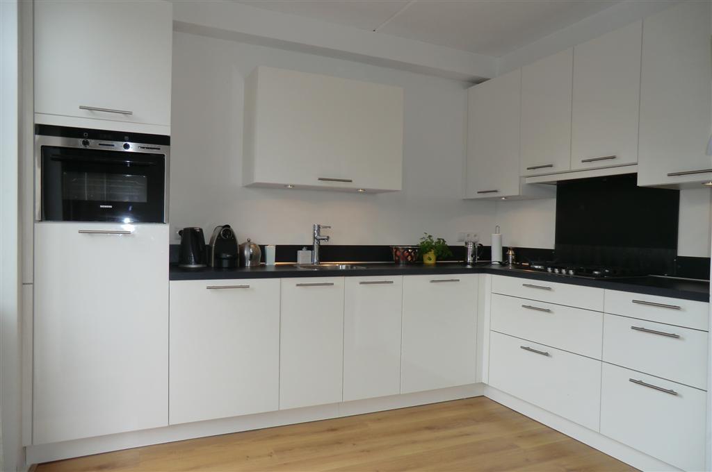 Open keuken met een complete keukeninrichting in hoekopstelling voorzien van diverse laden en kastjes, 4-pits gaskookplaat, afzuigkap, vaatwasmachine, koelkast, combi oven/magnetron en een spoelbak.